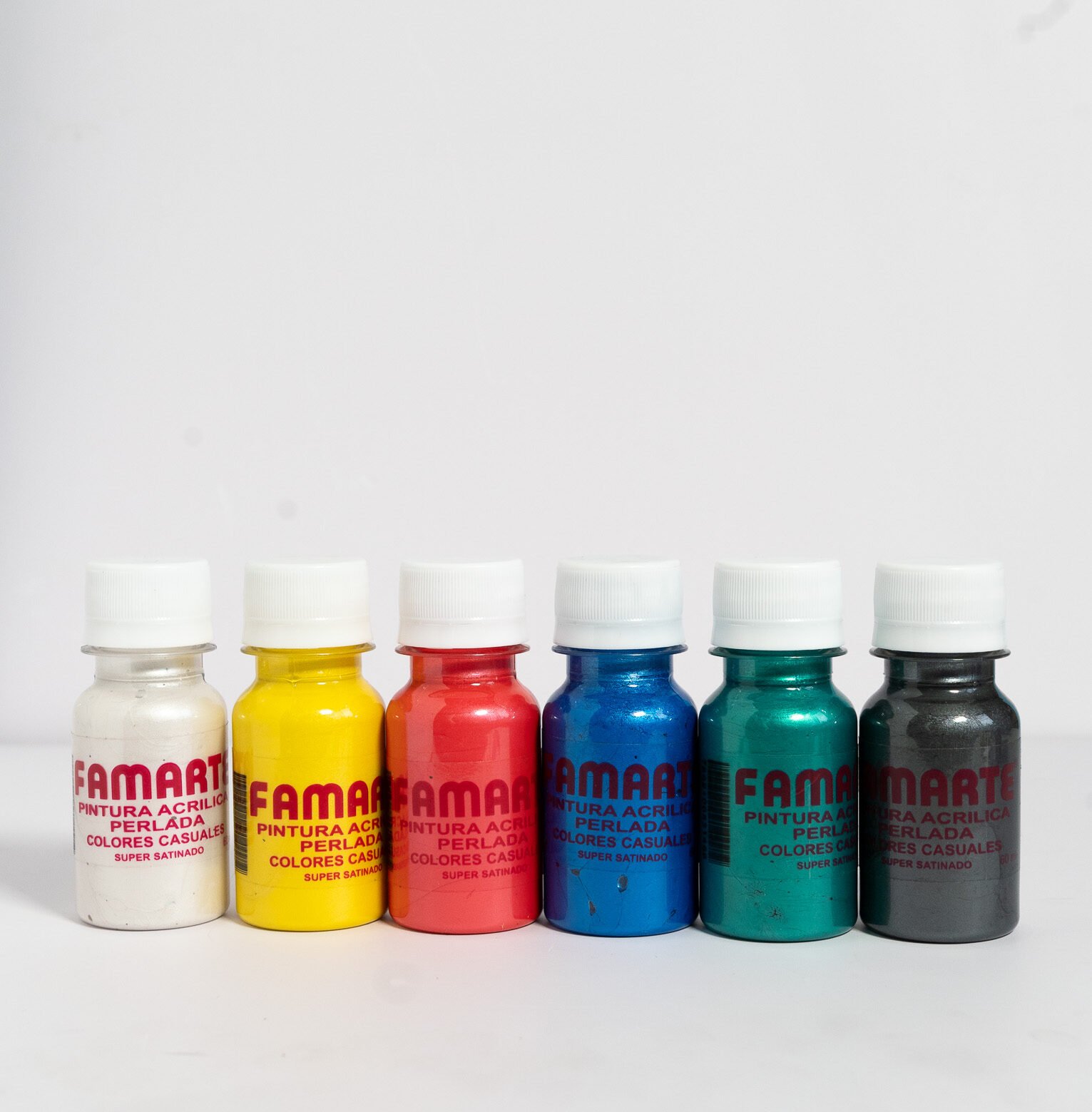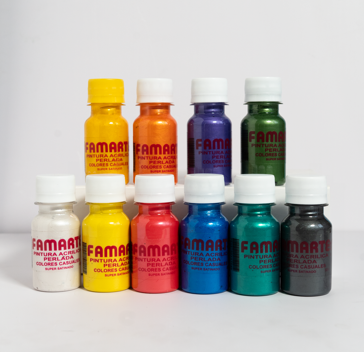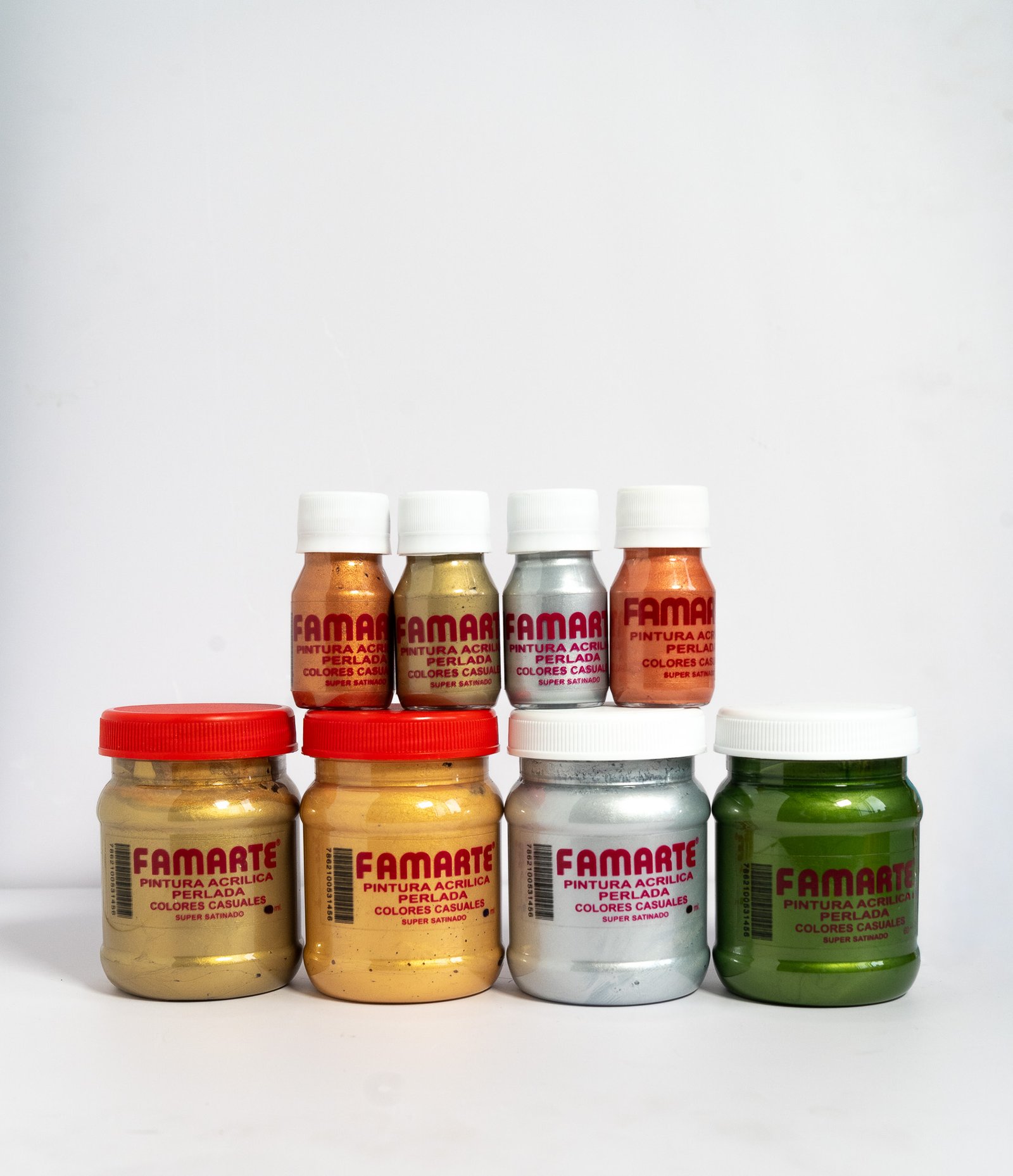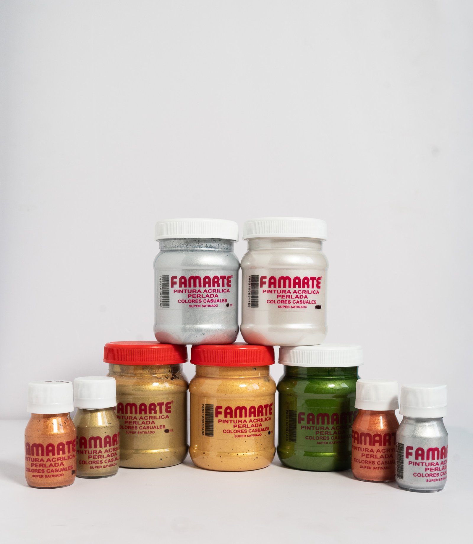 Las gamas Perlada y Metalizada Famarte ofrecen brillo, luminosidad y elegancia en cada trazo. Disponibles en 30 ml, 60 ml y 235 ml. Pinturas acrílicas base agua, no tóxicas y de alta calidad.